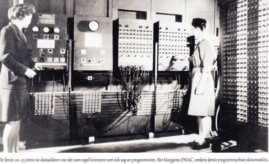 Verdens første programmerbare elektroniske datamaskin, ENIAC, ble satt i drift i 1946. i den anledningen ble det ansatt seks kvinnelige dataoperatører. Jobben deres var å «klargjøre» maskinen for ulike beregningsoppgaver, eller programmere den, som vi nok ville sagt i dag. «ENIAC-jentene» ble trendsettere i den forstand at programmeringsoppgaver raskt bel oppfattet som et typisk kvinneyrke. Arbeid med programvare ble oppfattet som «feminint», i motsetning til utvikling av selve maskinene, som var det «viktigste» (og mannsdominerte) arbeidet. Slik fortsatte det utover 1950- og 1960- tallet. I 1967 oppfordret magasinet Cosmopolitan, med den største selvfølgelighet, sine kvinnelige lesere til å vurdere en karriere innen programmering. Det var et passende yrke for en ambisiøs, ung dame.